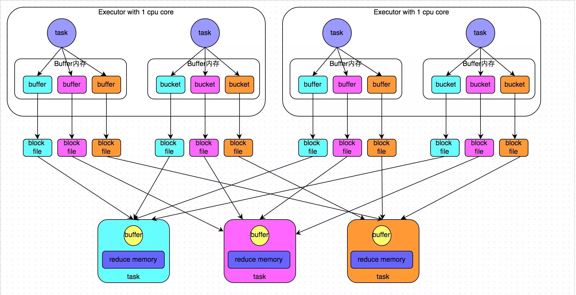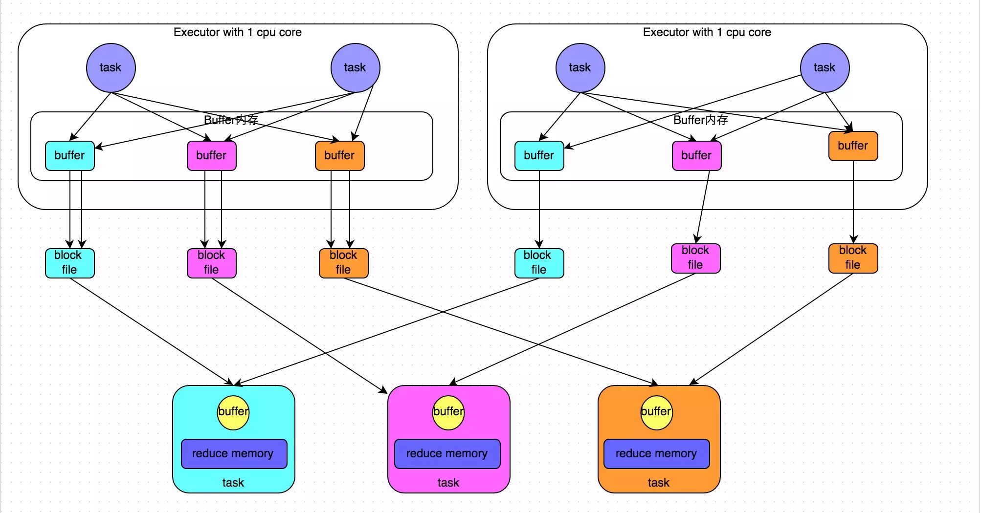 当Executor的CPU core执行完一批task,接着执行下一批task时,下一批task就会复用之前已有的shuffleFileGroup,包括其中的磁盘文件。也就是说,此时task会将数据写入已有的磁盘文件中,而不会写入新的磁盘文件中。因此,consolidate机制允许不同的task复用同一批磁盘文件,这样就可以有效将多个task的磁盘文件进行一定程度上的合并,从而大幅度减少磁盘文件的数量,进而提升shuffle write的性能。