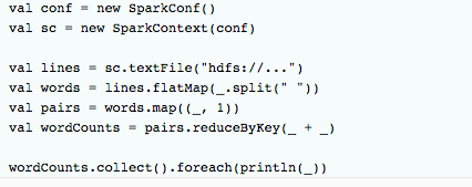 这里我们就以Spark最基础的入门程序——单词计数来举例,如何用最简单的方法大致推算出一个stage对应的代码。如下示例,在整个代码中,只有一个reduceByKey是会发生shuffle的算子,因此就可以认为,以这个算子为界限,会划分出前后两个stage。