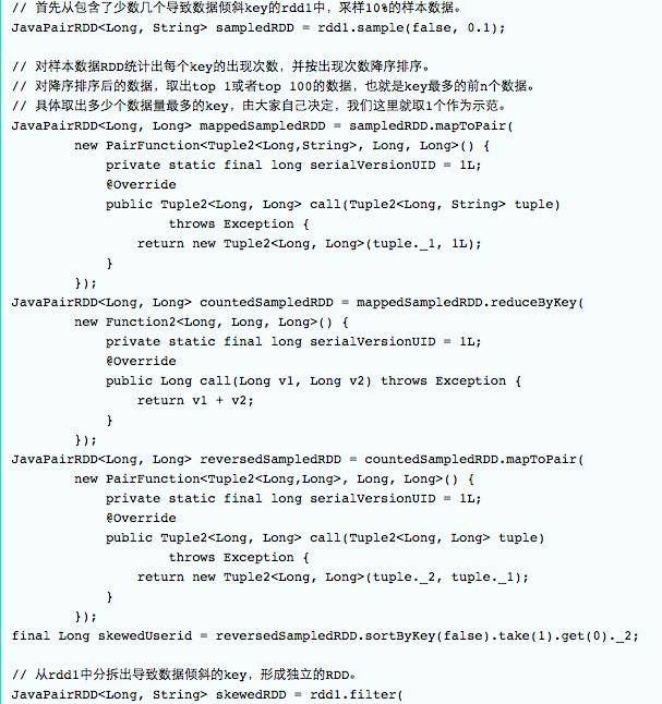 对包含少数几个数据量过大的key的那个RDD,通过sample算子采样出一份样本来,然后统计一下每个key的数量,计算出来数据量最大的是哪几个key。
