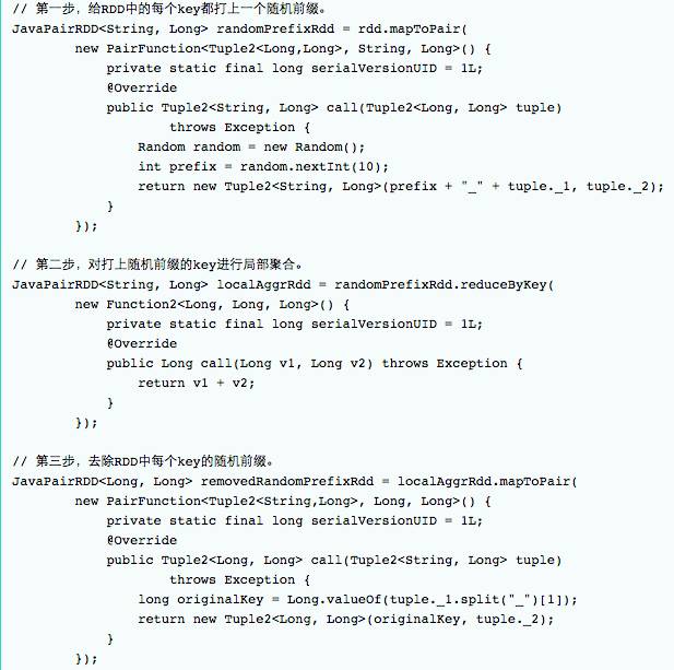 方案实现思路:这个方案的核心实现思路就是进行两阶段聚合。第一次是局部聚合,先给每个key都打上一个随机数,比如10以内的随机数,此时原先一样的key就变成不一样的了,比如(hello, 1) (hello, 1) (hello, 1) (hello, 1),就会变成(1_hello, 1) (1_hello, 1) (2_hello, 1) (2_hello, 1)。接着对打上随机数后的数据,执行reduceByKey等聚合操作,进行局部聚合,那么局部聚合结果,就会变成了(1_hello, 2) (2_hello, 2)。然后将各个key的前缀给去掉,就会变成(hello,2)(hello,2),再次进行全局聚合操作,就可以得到最终结果了,比如(hello, 4)。