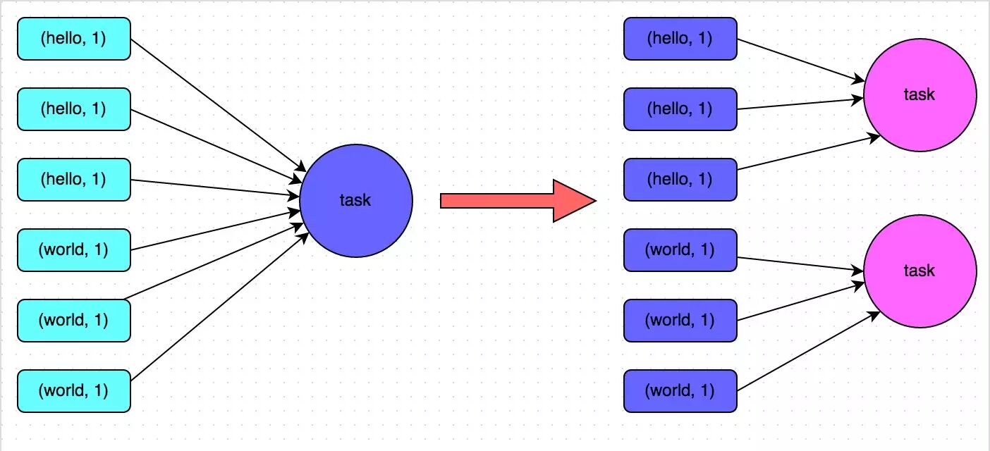 方案实践经验:该方案通常无法彻底解决数据倾斜,因为如果出现一些极端情况,比如某个key对应的数据量有100万,那么无论你的task数量增加到多少,这个对应着100万数据的key肯定还是会分配到一个task中去处理,因此注定还是会发生数据倾斜的。所以这种方案只能说是在发现数据倾斜时尝试使用的第一种手段,尝试去用嘴简单的方法缓解数据倾斜而已,或者是和其他方案结合起来使用。