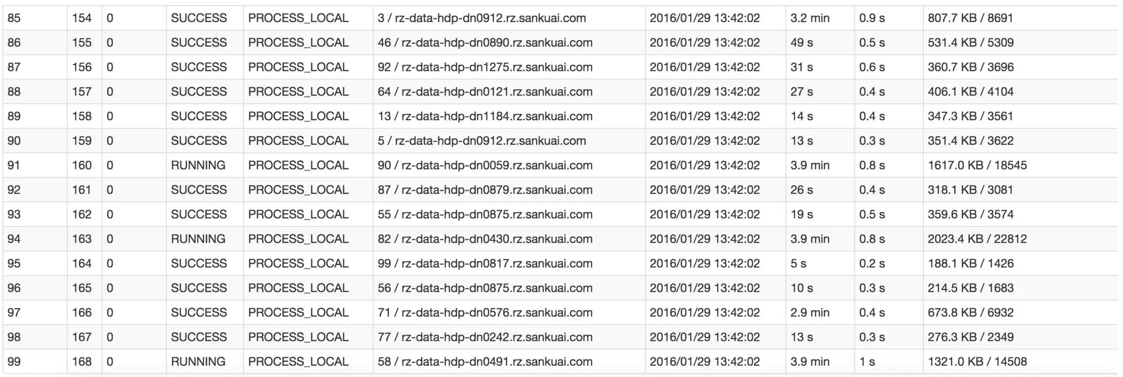 比如下图中,倒数第三列显示了每个task的运行时间。明显可以看到,有的task运行特别快,只需要几秒钟就可以运行完;而有的task运行特别慢,需要几分钟才能运行完,此时单从运行时间上看就已经能够确定发生数据倾斜了。此外,倒数第一列显示了每个task处理的数据量,明显可以看到,运行时间特别短的task只需要处理几百KB的数据即可,而运行时间特别长的task需要处理几千KB的数据,处理的数据量差了10倍。此时更加能够确定是发生了数据倾斜。