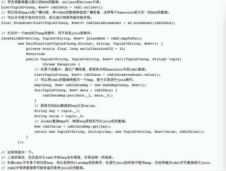 方案适用场景:在对RDD使用join类操作,或者是在Spark SQL中使用join语句时,而且join操作中的一个RDD或表的数据量比较小(比如几百M或者一两G),比较适用此方案。