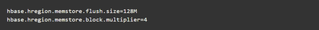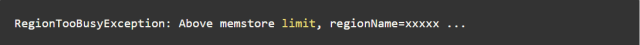 这个是Region的memstore占用内存大小超过正常的4倍,这时候会抛异常,写入请求会被拒绝,客户端开始重试请求。当达到128M的时候会触发flush memstore,当达到128M * 4还没法触发flush时候会抛异常来拒绝写入。两个相关参数的默认值如下: