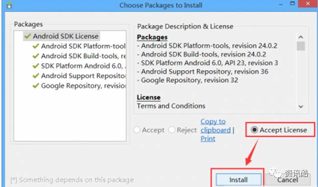 这里千万注意只需要勾选3个Android SDK Platform-tools、Android SDK Build-tools、API23下的SDK Platform (编译的时候会提示你需要的api版本,目前是API23)
