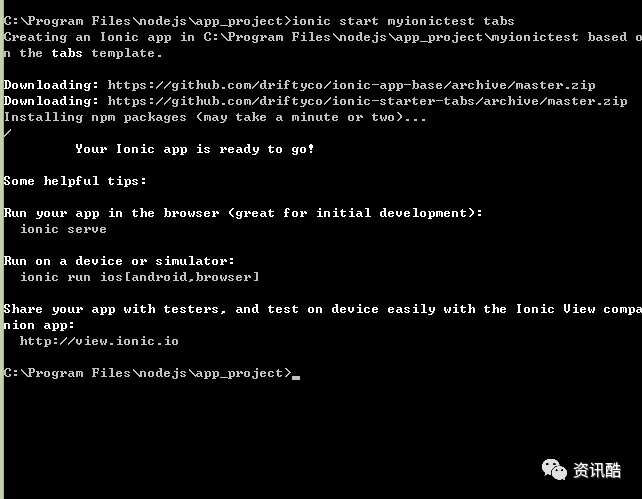 ionic start myionictest tabs(创建过程y/n询问是否打开官网n即可)