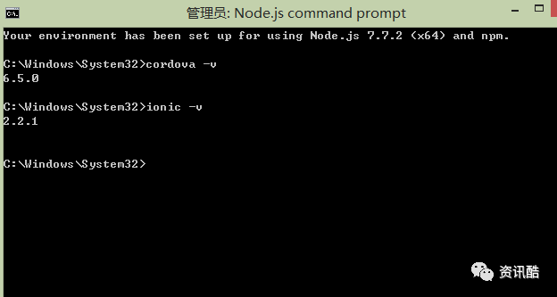 执行 cordova ionic 命令、运行下面的命令来确认它们被成功安装: