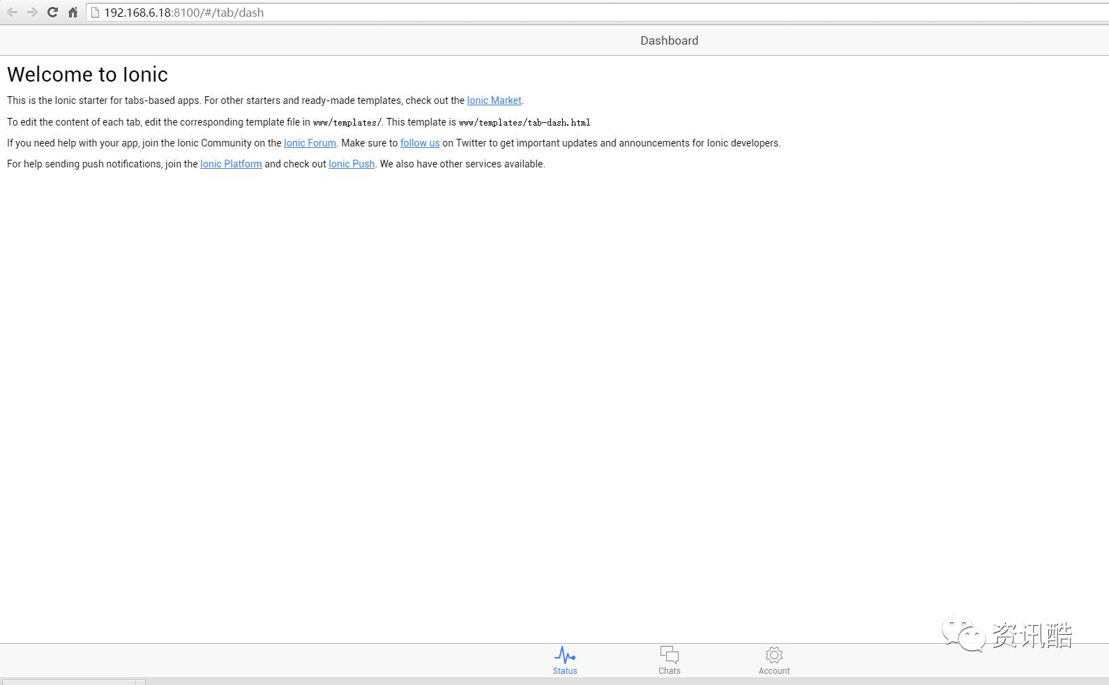 现在我们可以运行ionic server预览下项目、显示如下已经搭建好了一个移动混合式app ionic 框架
