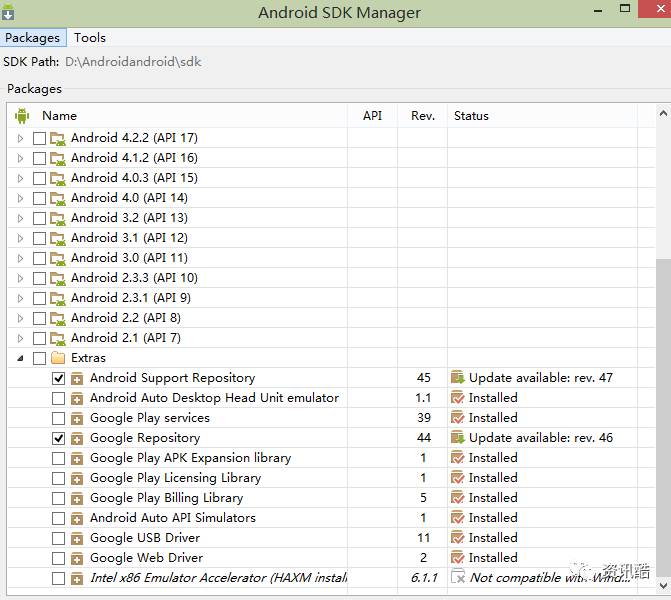 注意:执行androidsdk目录下的SDK Manager.exe即可打开工具包 如果遇到打不开的情况请用管理员运行!!!