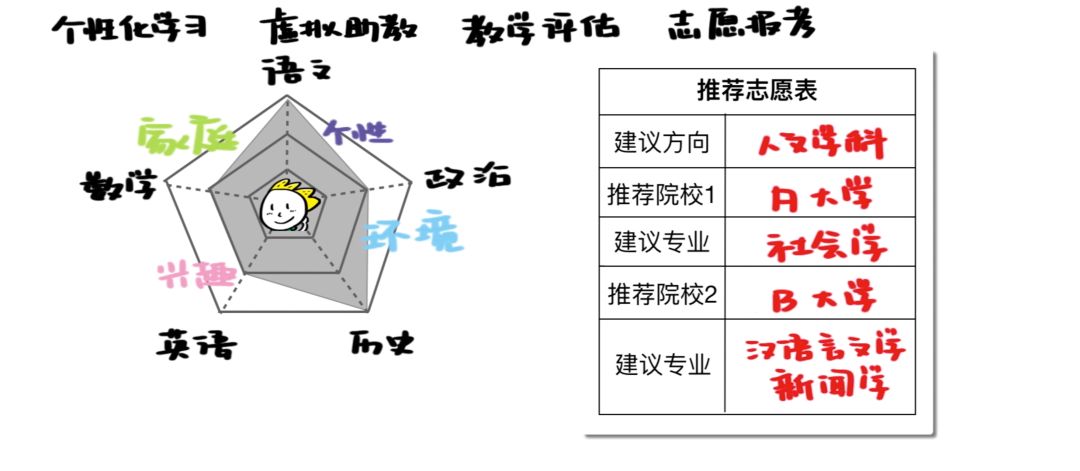 再比如志愿报考,综合家庭、个性、兴趣、社会环境等多维度信息,为学生提供适合的学校和专业推荐。大学的新学期选课,同样可以使用类似系统。