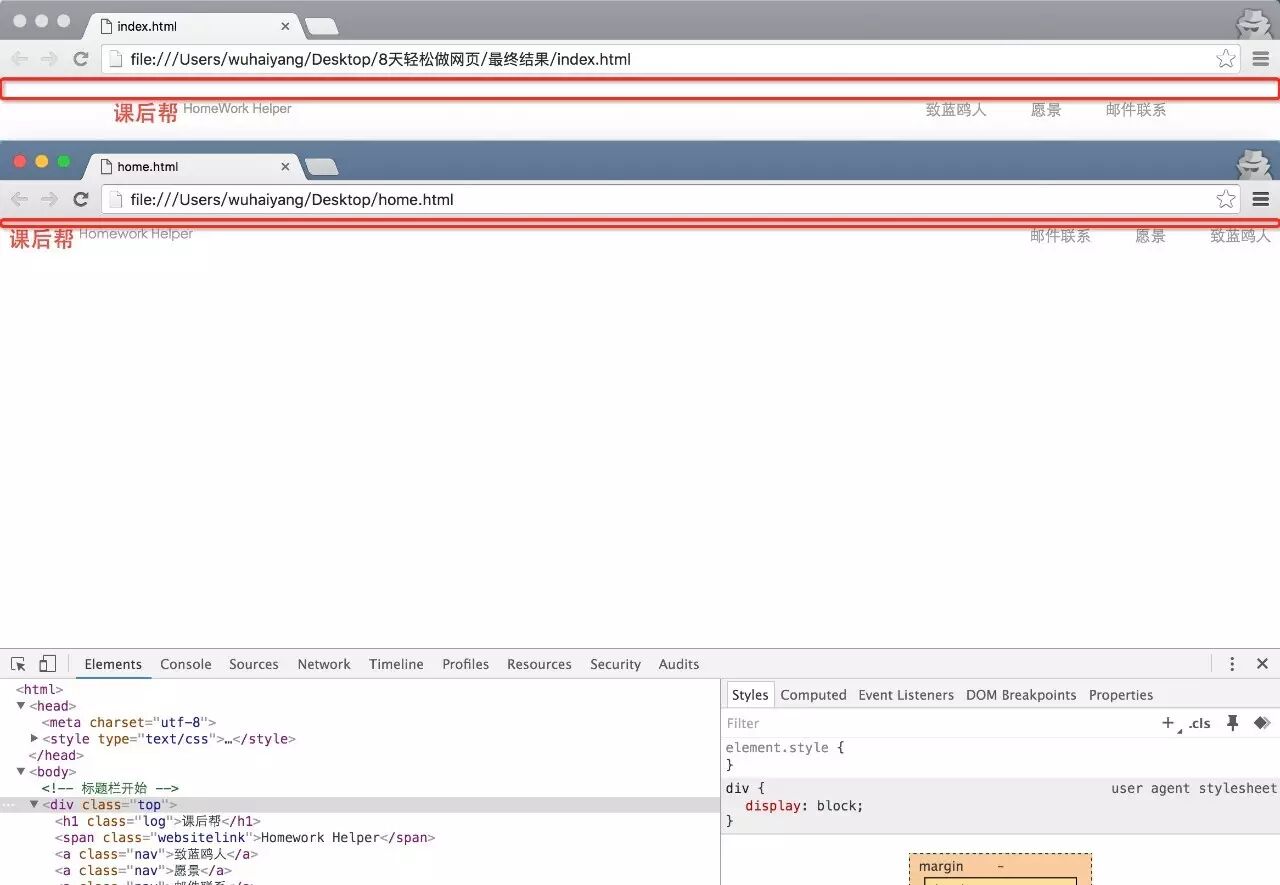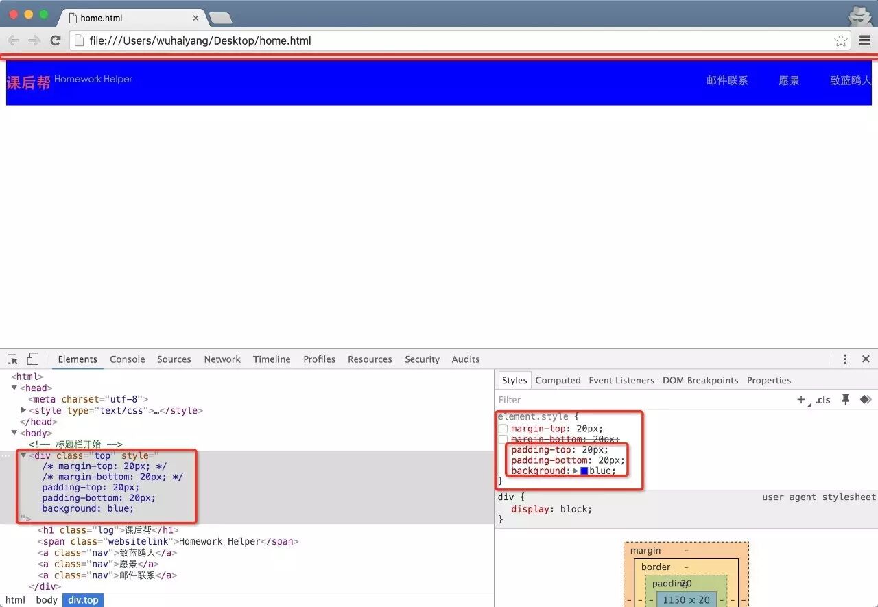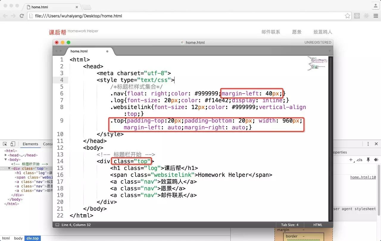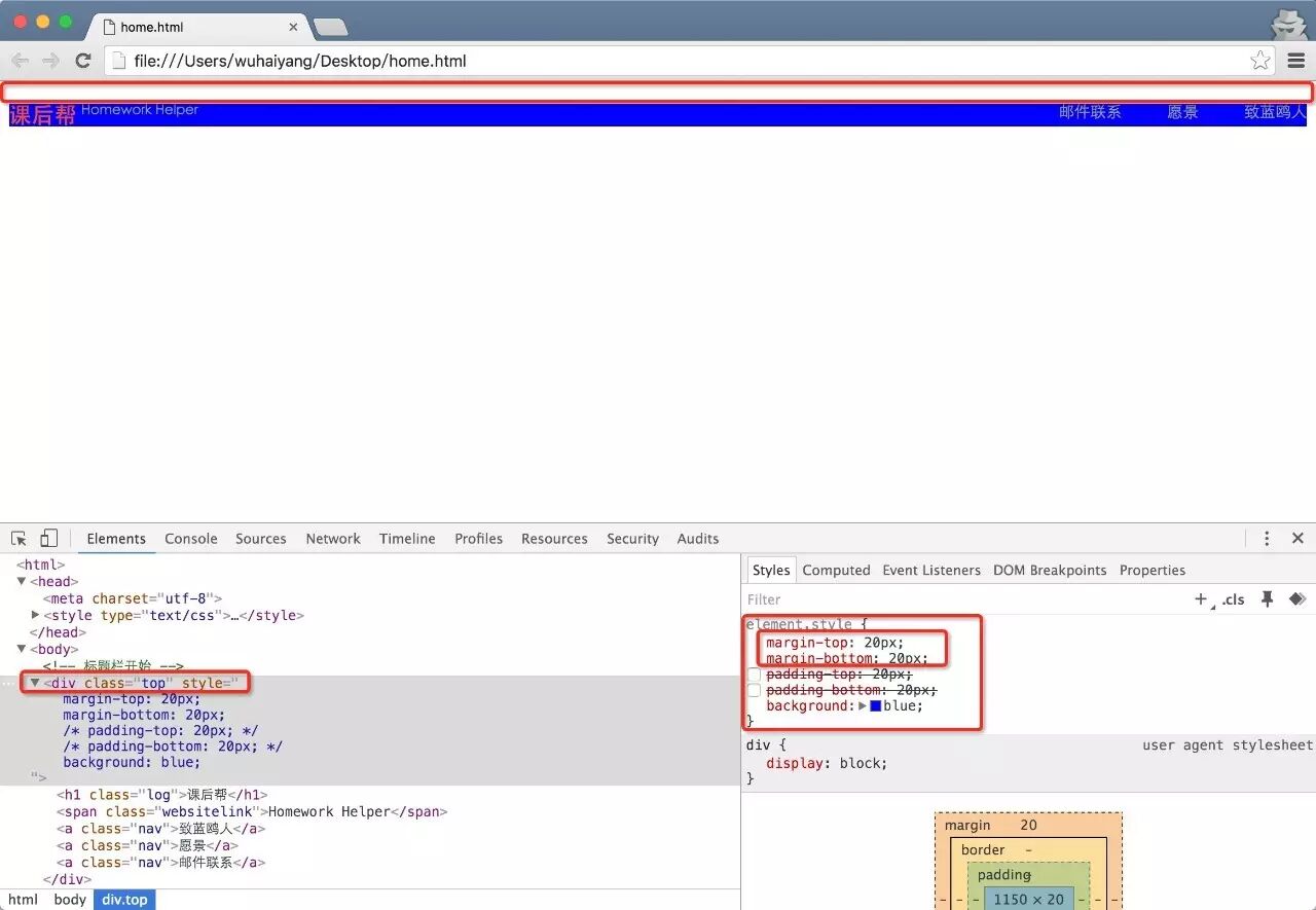 如果大家对我们之前所铺垫的内容掌握了话,那肯定心里已经有数了,边距就是margin,我们通过Chrome的检查元素来试验,试验好之后,达到了我们预期的效果,在把代码写入到sublime中。