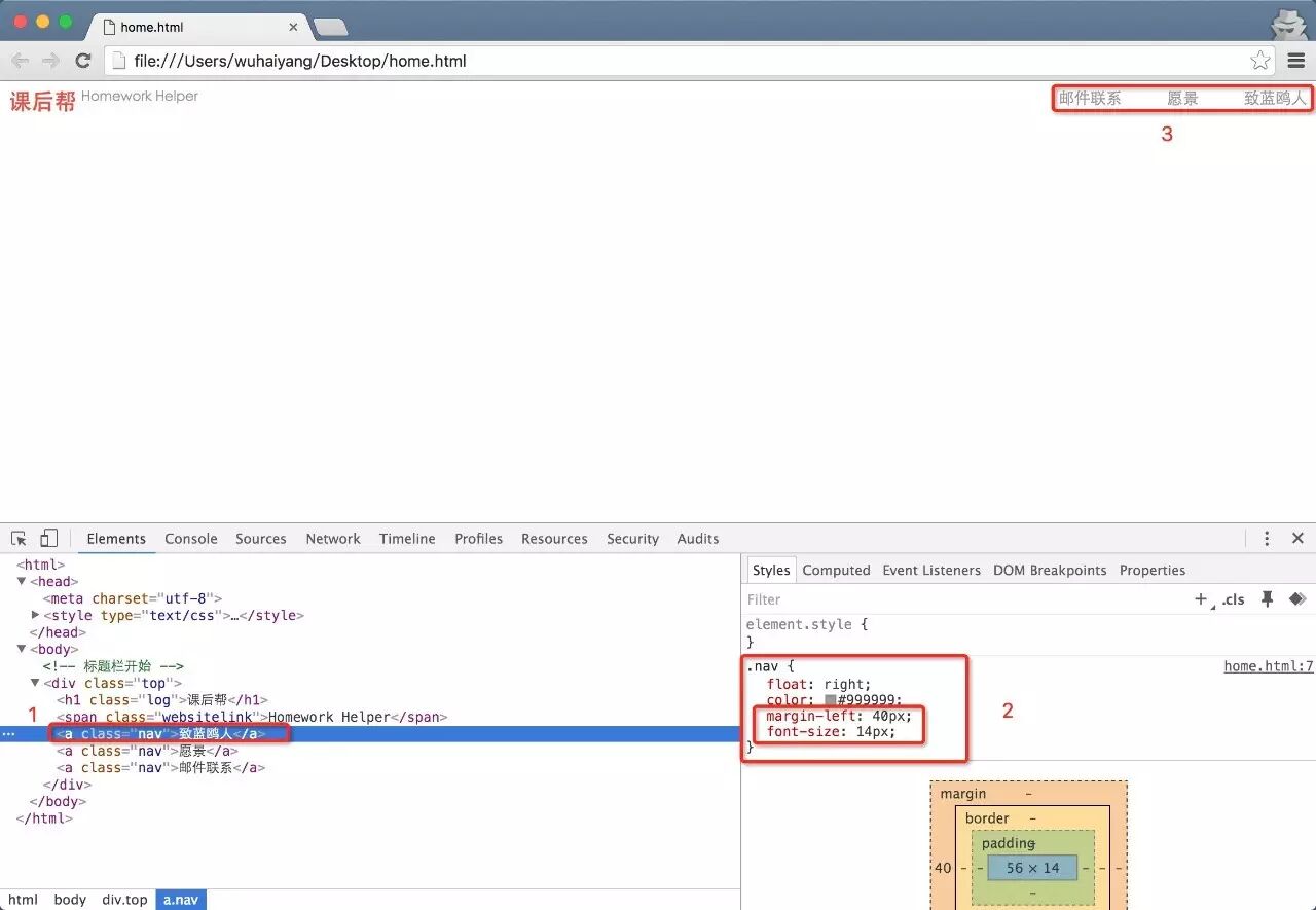 在数字1中,我们选中了致蓝鸥人标签,在数字2中,我们发现有设置样式的nav,在其中我们写入margin-left:40px;之后,就有了边距了,然后和我们理想效果还有误差的就是文字大小,所以我们又设置了font-size:14px,就达到了数字3的一个效果,此时就跟我们理想的效果一样了。