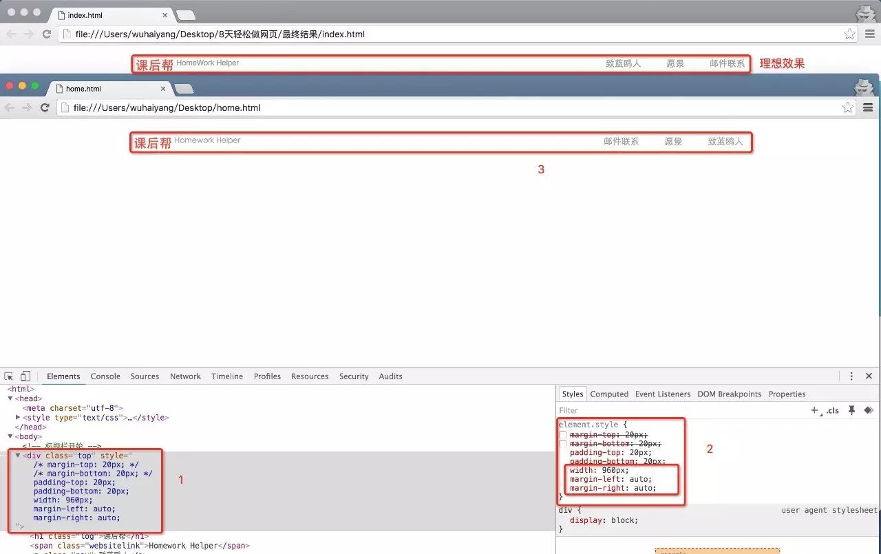 数字1是我们选中的div,因为顶端都是包裹在div中的,如果我们想要居中,是一定要搞定它的。此时右侧数字2就出现了设置元素样式的界面,其实跟刚刚我们设置的padding是一样的位置。那么首先我们从简单的开始,就是设置960的宽度,然后想要让元素居中,我们之前提到过,应该使用margin-left:auto和margin-rigth:auto;就达到了数字3我们的理想效果了。