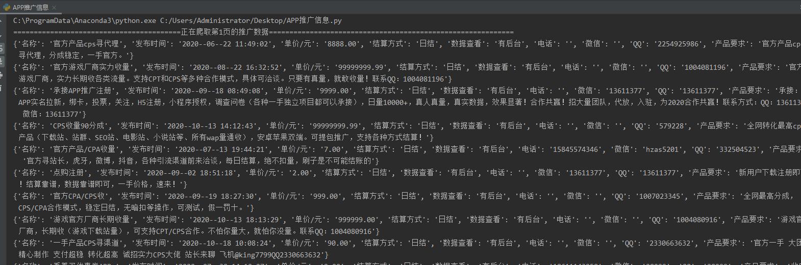 f = open('APP推广数据.csv', mode='a', encoding='utf-8', newline='') csv_writer = csv.DictWriter(f, fieldnames=['名称', '发布时间', '单价/元', '结算方式', '数据查看', '电话', '微信', 'QQ', '产品要求']) csv_writer.writeheader()