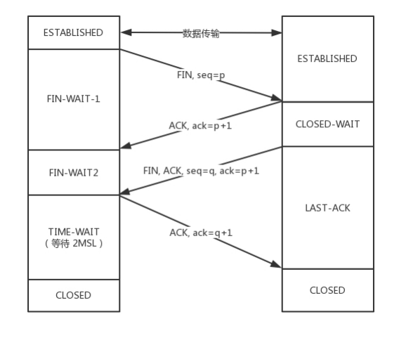 假设主动发起关闭的为客户端A。被动关闭的为服务端B。流程如下: