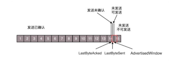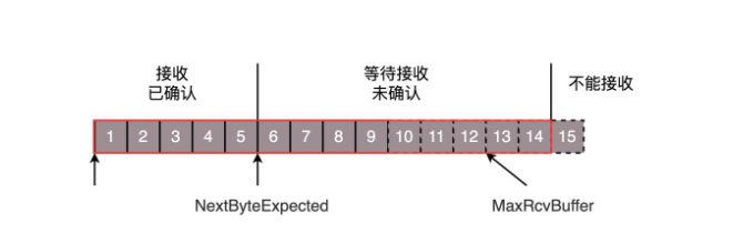 接收端同样维护着一个滑动窗口如下图。红色框就是一个滑动窗口,接收已确认是指已经发送Ack应答包给主机A的数据包,这些包在应用层程序读取后,窗口开始向右滑动。而等待接收未确认的是则是还没收到主机A的数据包。且当前能收到的最大数据包用量即为:(窗口大小-接收已确认大小)。