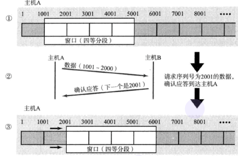 窗口左边界的左边,是已经完成并被Ack确认的数据包,窗口中是已经发送但没有Ack确认的数据包,窗口右边界右边是还未发送的数据包。每当主机B应答后,窗口就会向前滑动。同样,这里的确认应答也有优化的空间。例如:这里主机A一共发送了1、2、3、4总共四个数据包。假设主机B按照顺序收到,同时回复了4个Ack应答包,但是回复1、2、3的应答包丢失了,不过如果4的应答包收到,此时主机A还是能判断出1、2、3这几个包是已经确认收到的,就不需要触发超时重传了。
