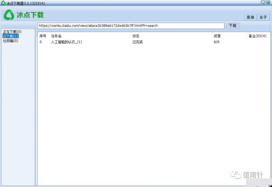 2:将复制的链接直接放在冰点搜索器的搜索框中,点击下载,即可完成下载,点击已下载,再点击文章即可打开文章的储存位置。(此时的保存位置是默认的保存位置,改变保存位置可看第三步骤)