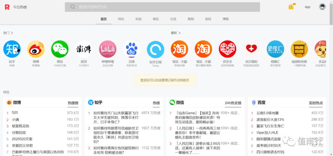这是一个资讯网站。就如其名称一样今日热榜提供各站热点聚合:微信、今日头条、百度、知乎、V2EX、微博、贴吧、豆瓣、天涯、虎扑、Github、华尔街见闻等等全网热点新闻排行榜服务。