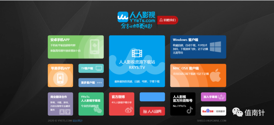 人人影视起初是一个以分享、交流、学习为宗旨的外国影视节目非专业字幕组。前身是2003年由加拿大华裔留学生小鬼神创立YYeTs字幕组,于2006年6月1号正式建立独立论坛,并逐渐成为知名影视站点之一。网站包括动作片、喜剧片和综艺片等十几个频道。喜欢美剧的同学们应该知道,该站是必备的。