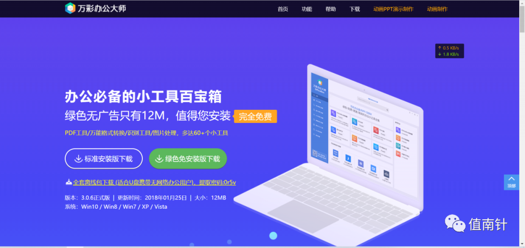 万彩办公大师OfficeBox是一款由万彩科技研发的免费办公工具软件超级套装,几乎可以满足日常各种办公工具需求。它内置了60多款强大的,无任何广告及插件的绿色办公组件,如PDF工具集(PDF转换(PDF to WORD)PDF 合并分割水印);文档音视频图片转换工具集;OCR工具集;屏幕录制工具集;图片处理工具集;文件处理工具集等。所有的套装工具不需要安装,直接可以绿色加载启动,省去了用户为安装各种办公软件而寻找工具、安装及卸载的麻烦。