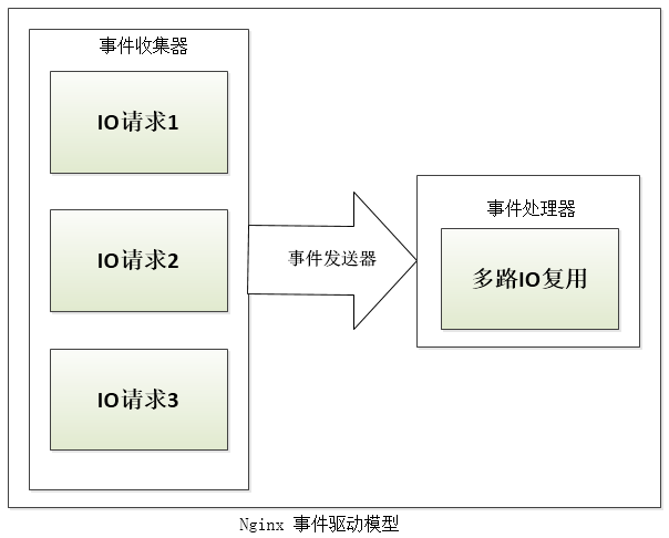 如上图所示,Nginx 的事件驱动模型由事件收集器、事件发送器和事件处理器三部分基本单元组成。其中,事件收集器负责收集 worker 进程的各种 IO 请求,事件发送器负责将 IO 事件发送到事件处理器,而事件处理器负责各种事件的响应工作。