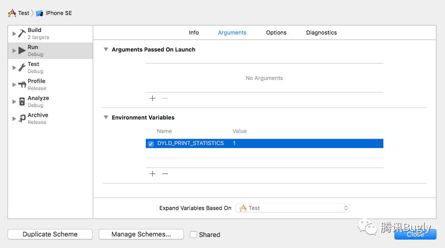 Project→Scheme→Edit Scheme...,然后找到Run→Environment Variables→+,添加name为DYLD_PRINT_STATISTICSvalue为1的环境变量。