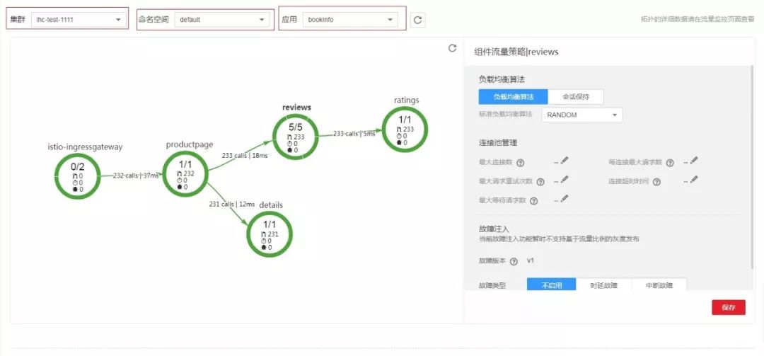 右侧出现拓扑图,在上面的选项栏中选择集群,命名空间,应用。然后点击我们想配置的组件,这里是 reviews,右侧则会出现流量治理的界面。