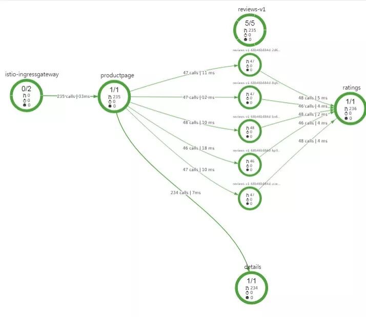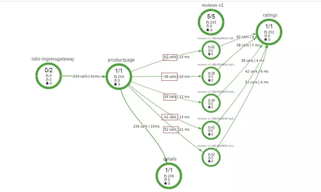我们回到流量监控图,可以看到组件之间的访问情况。在给ratings配置了中断故障后,原本调用ratings组件的reviews组件,已经无法和ratings通信了。