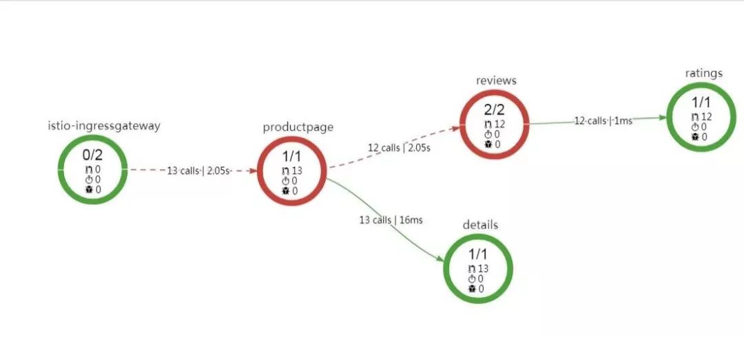 这时候我们打开流量监控界面观察下发现productpage与reviews受到了明显的影响。红色表示请求状态极差,虚线表示是由时延造成的。