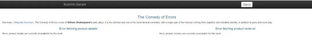 此时,用浏览器打开bookinfo的productpage页面,会显示 Error fetching product details 和 Error fetching product reviews 的错误信息: