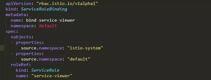 创建 ServiceRoleBinding 对象,用来把 service-viewer 角色指派给所有 istio-system 和 default 命名空间的服务: