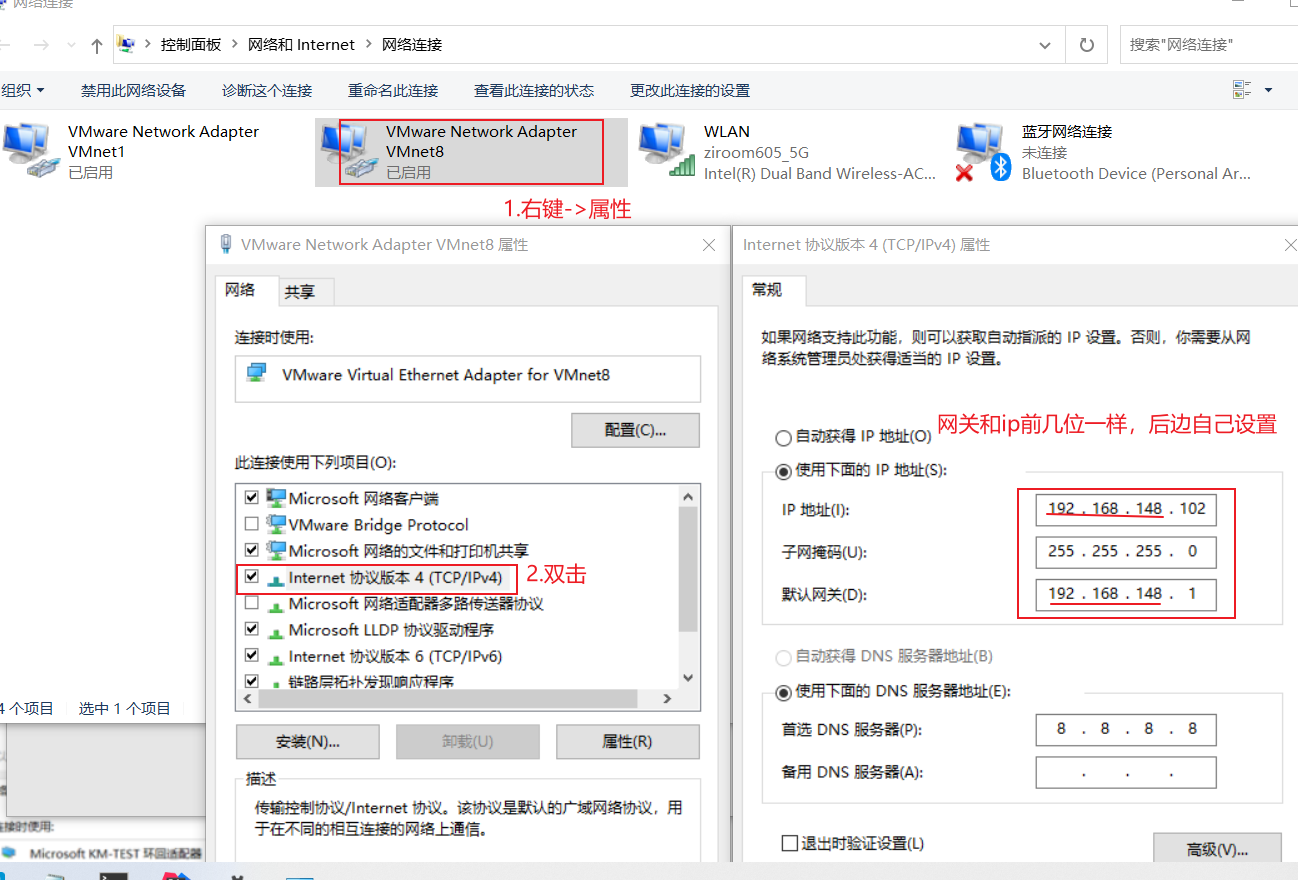 注意:这里VMnet8的ip千万千万千万不要和任何一台虚拟机的IP重了!