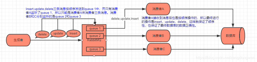 比如:业务场景是这样的:我们需要根据mysql的binlog日志同步一个数据库的数据到另一个库中,加如在binlog中对同一条数据做了insert,update,delete操作,我们往MQ顺序写入了insert,update,delete操作的三条消息,那么根据分析,最终同步到另一个库中,这条数据是被删除了的。但是,如果这三条消息不是按照insert,update,delete顺序被消费,而是按照delete,insert,update的顺序被消费,那么最终这条数据是会保存到新库中的。这就导致了数据错乱了。下面分别讲解下RabbitMQ是如何保证消息的顺序性。