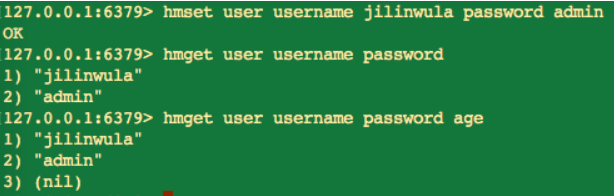 hmset 命令和 hmget 命令分别是批量设置和获取值的,hmset 命令没有什么要注意的,但 hmget 命令要特别注意,当我们获取一个不存在的 key 或者不存在的 field 时,Redis 并不会报错,而是返回 nil。并且有几个 field 不存在,则 Redis 返回几个 nil。