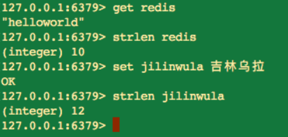 由于每个中文占用 3 个字节,所以 jilinwula 这个键,返回是字符串长度为 12,而不是 4。
