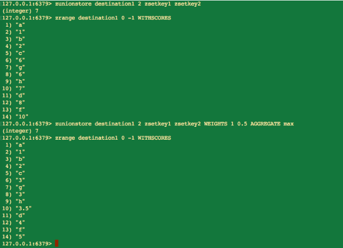 zunionstore destination numkeys key [key ...] [WEIGHTS weight] [AGGREGATE SUM/MIN/MAX] |