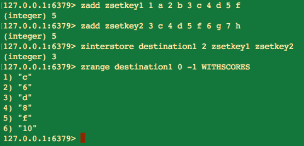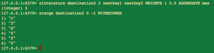 zinterstore destination numkeys key [key ...] [WEIGHTS weight] [AGGREGATE SUM/MIN/MAX] |