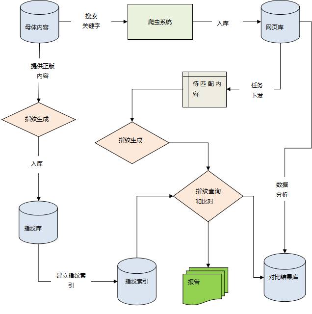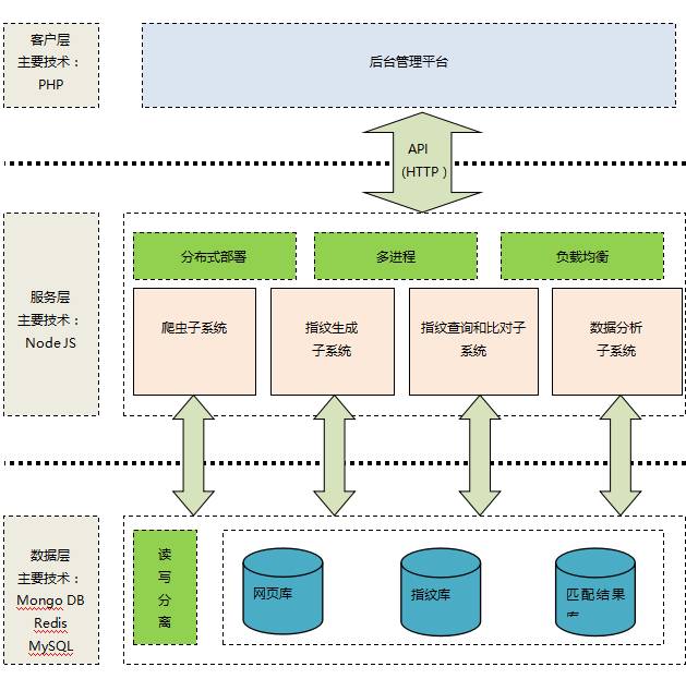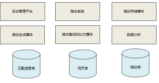 达观指纹追踪系统主要由爬虫系统、指纹生成系统、指纹存储、指纹查询和比对、数据分析、后台管理系统等几个主要模块构成,如图4所示。其中存储层包括匹配结果信息库、网页库以及指纹库。