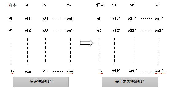 Minhash算法采用最小哈希函数族(一组随机的最小哈希函数)来构建文档的最小哈希签名。文档的最小哈希签名矩阵是对原始特征矩阵降维的结果。应用过程中,可以使用k个最小函数分别计算出集合的哈希最小值。设hi表示第i个最小hash函数,最小签名矩阵中列向量为样本si的最小签名向量,其中wij表示第j个最小hash函数对样本i的最小哈希值。