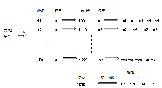 b) 整个特征向量集合迭代上述运算后,根据V中每一维向量的符号来确定生成的f-bit指纹的值,如果V的第i维为正数,则生成f-bit指纹的第i维为1,否则为0。
