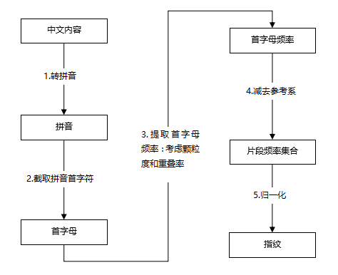 指纹生成的过程主要包括将文本全部转换成拼音、截取每个字拼音的首字母、统计该粒度内字母的频率分布、通过和参考系比较,将结果进行归一化、按字母序,将数字表征转换成数字。