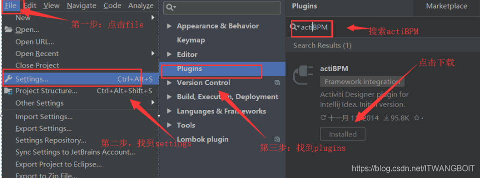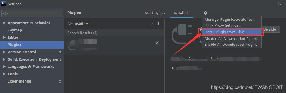 1:打开IDEA,File->Settings->Plugins;搜索actiBPM,点击Installed,安装成功重启IDEA即可;如下图: