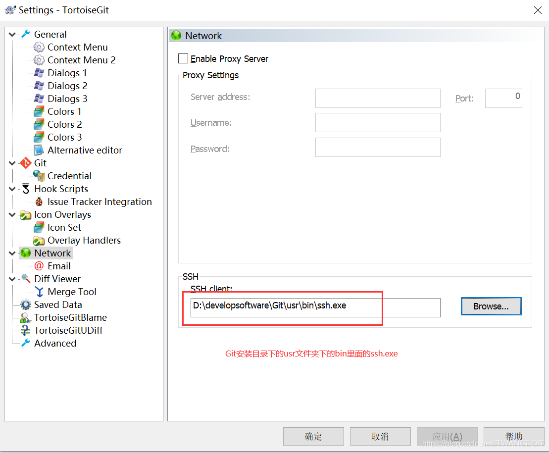 3:修改TortoiseGit的Settings里的NetWork如下图,换成使用Git自己的ssh命令行工具