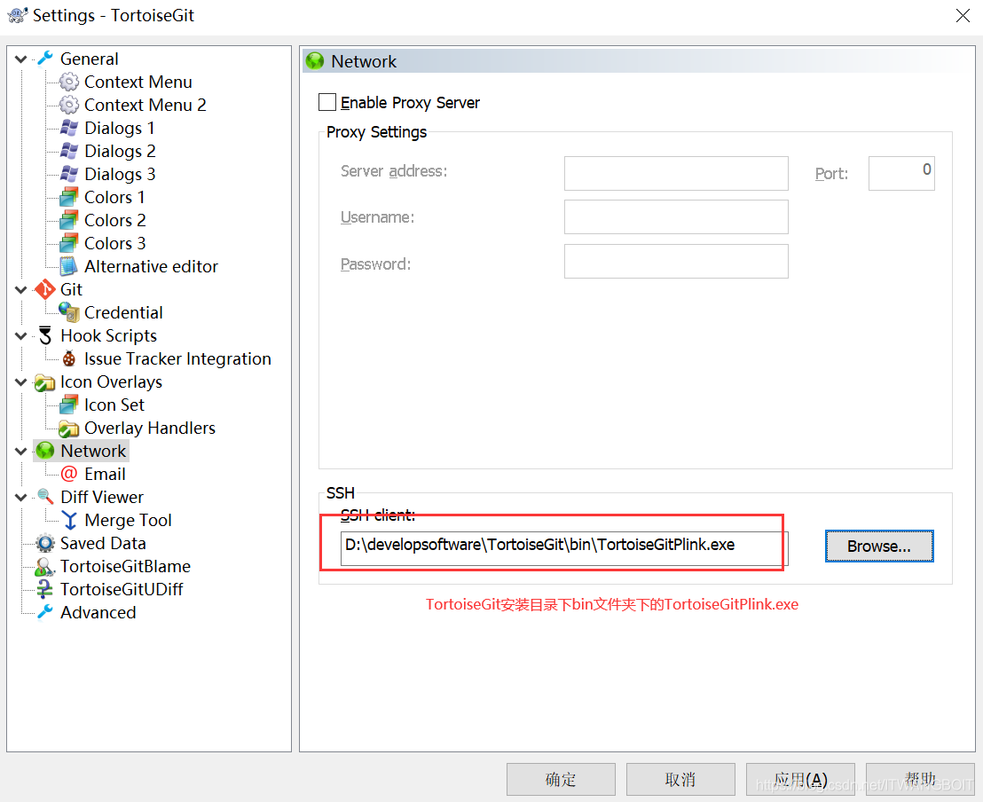2:我们都知道如果要使用SSH协议来操作github或者gitlab上的repository时,需要在本地电脑上使用git命令生成一对公钥和私钥,然后把公钥配置到github或者gitlab里,私钥在本地电脑上存放(不会设置可以查看《设置github使用的SSH key》);这样一来用SSH协议操作中央服务器上的repository时,就不用再输入账号和密码来进行验证,而是git自动使用公钥和私钥进行对比,从而验证身份(重点:git使用本地的私钥和中央服务器上的公钥进行对比)。我们打开TortoiseGit上的Settings,查看Settings里的Network,会发现如下图:ssh client使用的是TortoiseGit的命令行工具,而不是git的命令行工具,所以这个TortoiseGitPlink.exe找不到私钥在哪里,并不会发送给中央服务器和公钥做对比。(直接用git的bash命令行来操作repository就没有这个问题的存在)