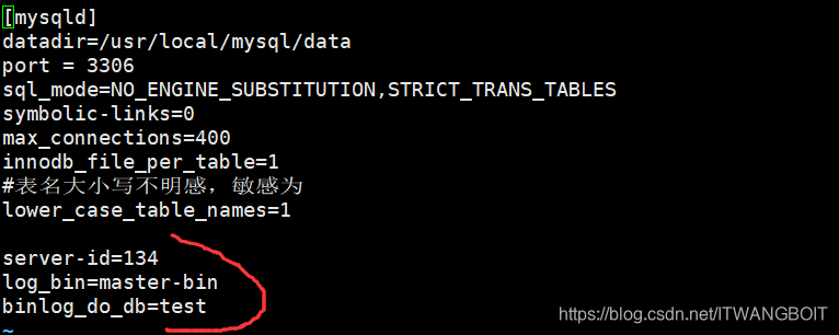 binlog_do_db=test //指定需要记录二进制日志的数据库,即需要同步的数据库名