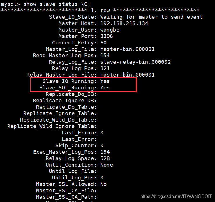 红框里的两个yes,分别表示slave的I/O线程和slave的SQL线程都正在运行,则说明主从模式配置成功,下面就可以操作主服务器的数据库,并查看从服务器中的同名数据库的变化。