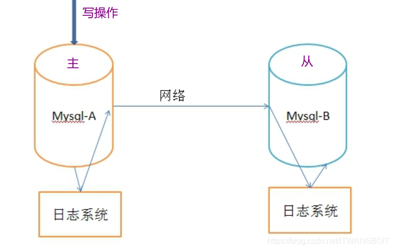 在Mysql-A的数据库事件(例如修改数据库的sql操作语句),都会存储到日志系统A中,然后Mysql-B会通过网络获取日志系统A中的日志。Mysql-B获取到日志后,写入本地日志系统B,然后一条条的将数据库事件在数据库Mysql-B中完成,从而完成主从复制。