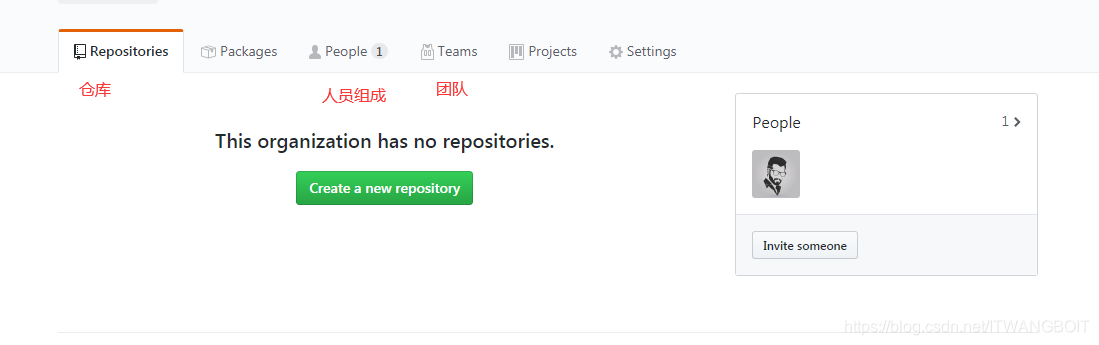 2:创建好Organization后,可以在Organization内创建Repository,创建Team,并可以invite member到People中;创建好organization后,People内就存在一个member:创建Organization的当前账号。