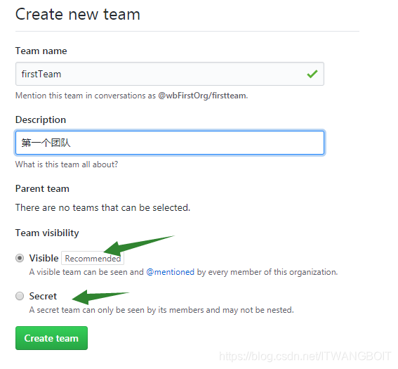 1:创建team时,选择可视性;visible:organization内所有人都可以看到这个team;secret:team内的人才可以看到这个team。